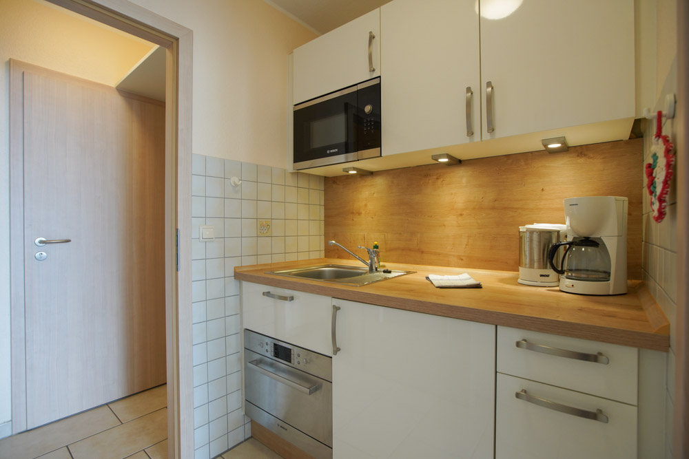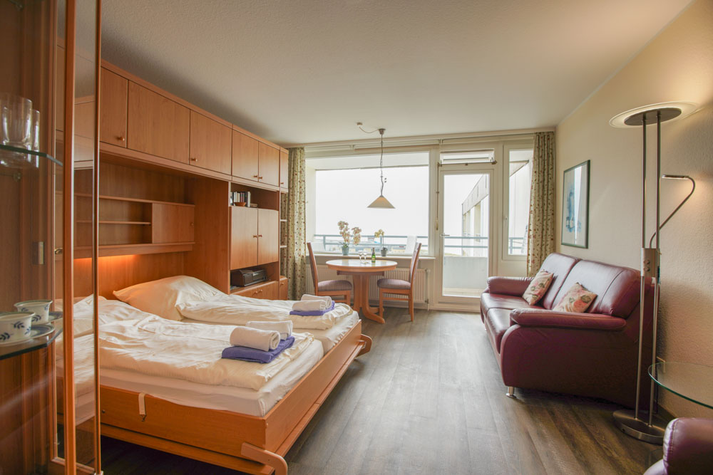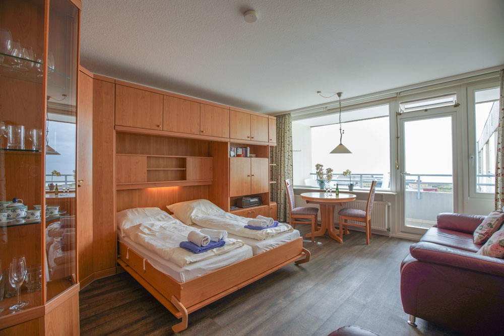 Erleben Sie Borkum hautnah. Gemütliches 30qm Ferienappartement für 2 Personen in 1. Meereslinie. Ihr Feriendomizil liegt in der 6. Etage im beliebten Haus Seeblick in der Bismarckstr. Die Ferienwohnung wurde in den vergangenen Jahren fortlaufend renoviert und bietet neben einer modernen Küche, einen großzügigen Wohnraum/Schlafraum mit Zugang zum großen Balkon sowie ein freundliches, hell gefliestes Bad mit Dusche und WC.